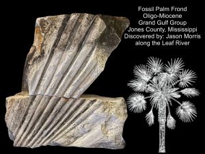 For this week’s Fossil Friday, we are continuing the theme from our last adventure with another new fossil discovery in south Mississippi. The Catahoula, Hattiesburg, and Pascagoula Formations make up the Grand Gulf Group. Its geologic expression can be observed as a broad band of alternating sandstone, siltstone, claystone, and occasional orthoquartzite throughout south Mississippi and nearing our Gulf coast. It is the basis for the hilly terrain of the extent of the Southern Pine Hills region, immediately south of the Jackson Prairie region of central Mississippi. These deposits formed during the late Oligocene and through the Miocene epochs as global climates cooled and sea levels fell. River deltas built out vast new lands into the Gulf where seas once occupied. Fossils are particularly rare in the Grand Gulf Group of Mississippi, with the exception of some isolated areas where plant fossil remains have been discovered.
