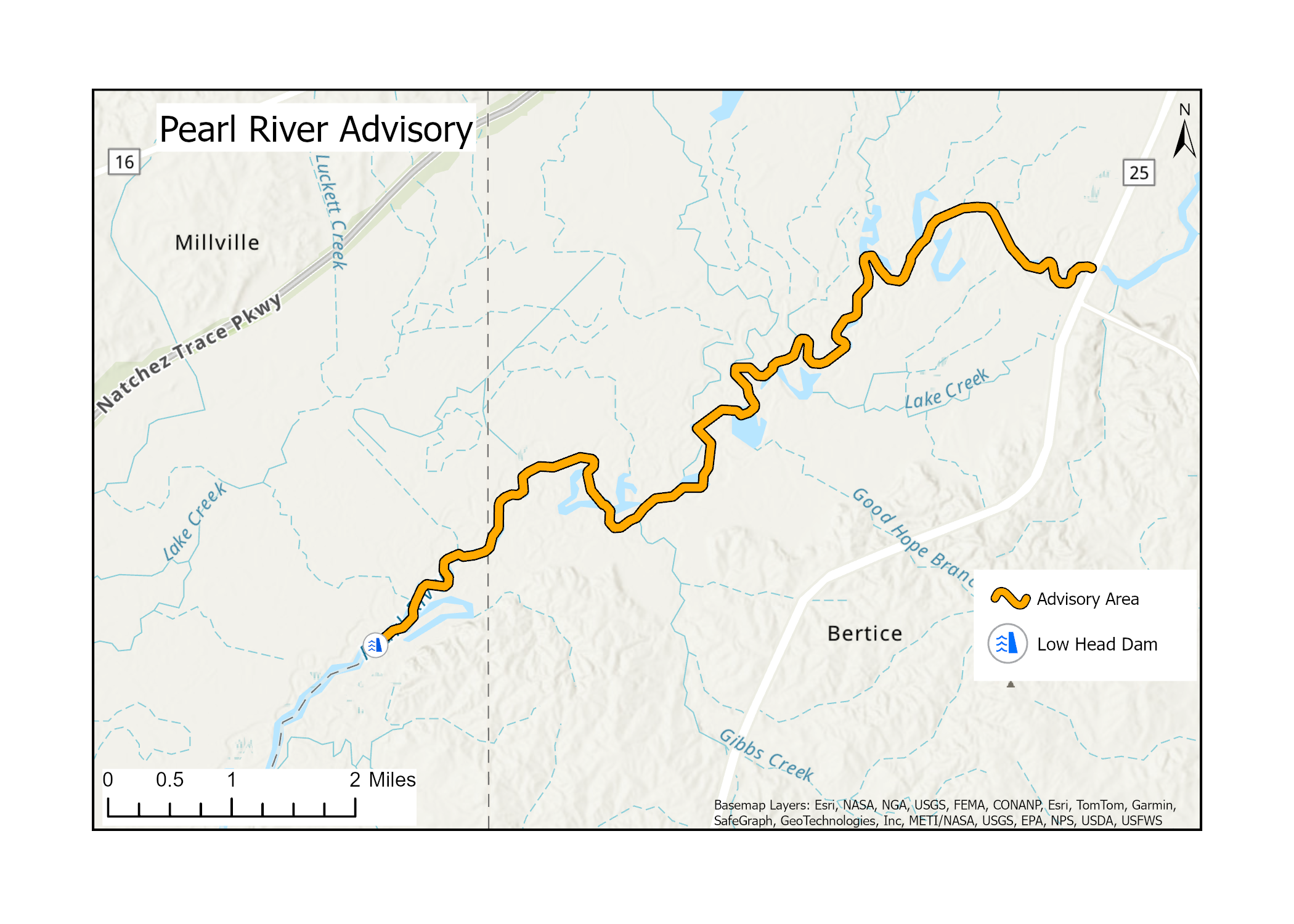 A: The advisory covers a section of the Pearl River — from the Highway 25 bridge to the Low Head Dam due to the presence of a Harmful Algal Bloom (HAB).