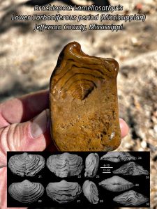 Today’s Fossil Friday brings us a chert gravel specimen of a brachiopod photographed in the field earlier this month by our MDEQ’s State Geological Survey scientists conducting routine fieldwork in the loess bluffs region of Jefferson County, Mississippi. This brachiopod fossil is called Lamellosathyris and is a particular type of extinct brachiopod belonging to a group called athyridides (thanks to our dear friend, Asa Asa, invertebrate paleontology expert from Missouri). It originated in limestone bedrock in the central Mississippi River Valley which date to the early Carboniferous period (Mississippian), some 350 million years ago.