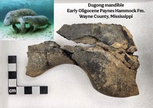 Dugongs are sirenians, a group of marine aquatic mammals that also include manatees and sea cows. Dugongs currently only inhabit the warm ocean waters of the Indo-West Pacific. They also once called the warm shallow waters of the northern Gulf of Mexico home during the Oligocene epoch, some 34 to 24 million years ago. Their remains can be found throughout Oligocene-aged limestone beds in south-central Mississippi.