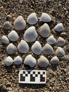 Today’s Fossil Friday brings us a collection of marine mollusk shells of an extinct genus of clam called Venericardia, a Late Eocene-aged fossil collected earlier this month by Anna Reginelli from a gravel bar along the Mississippi River in Bolivar County, Mississippi. These robust, heavily ribbed shells are from an ancient shallow sea, called the Jackson Sea, that once covered much of Mississippi nearly 40 million years ago. The presence of these seashells is very important to our State Survey geologists with MDEQ’s Mississippi Office of Geology conducting geologic mapping. These shells belong particularly to the Moodys Branch Formation of the Jackson Group. Other marine fossils such as shark teeth and even fossil bones of our State Fossil, the archaeocete whale, can be found on the Mississippi River gravel bars in the area where these ancient Venericardia fossil seashells were found.