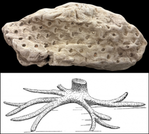 This large sandstone clast contains an impression of a fossil tree root called Stigmaria. Stigmaria is what is known as a form genus, which is a genus that is described for a specific part of an organism rather than the entire organism itself. This commonly occurs with plant remains since they tend to fossilize as individual components found separate from each other, so these different structures are assigned their own names. Stigmaria refers to root systems of ancient lycopod, or “scale” trees. Examples of these extinct trees include Lepidodendron and Sigillaria.