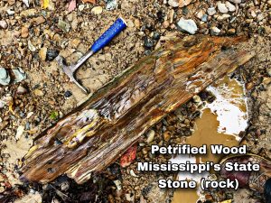 The photo features features an exquisitely preserved piece of silicified wood collected on a canoe trip from the Wolf River in Harrison County by Rep. Manly Barton, Mississippi House of Representatives District 109. It is likely derived from the Pliocene age outcrops of the Graham Ferry Formation which outcrop along the stream. This fossil wood is from a tree that grew in an ancient river delta, some 5 million years ago. The forests in this environment existed just before the onset of the Ice Ages of the Pleistocene.